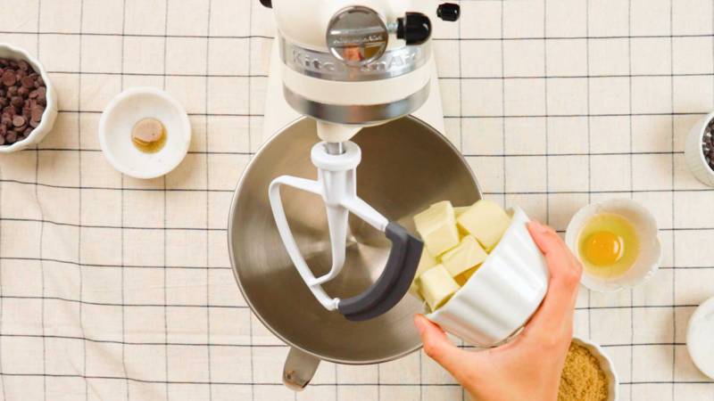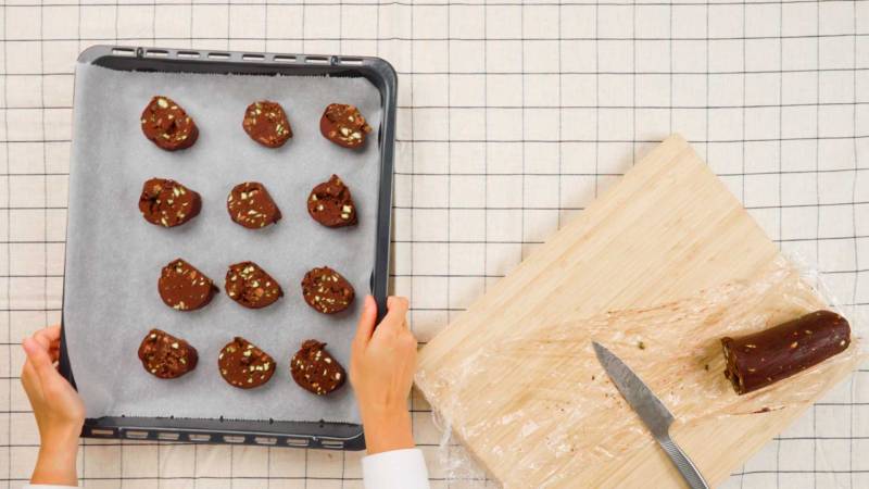 Den Ofen auf 175 °C vorheizen. Den gekühlten Teig in 2 cm dicke Stücke schneiden und auf ein mit Backpapier ausgelegtes Backblech legen, dabei darauf achten, dass zwischen den Keksen genügend Platz ist.