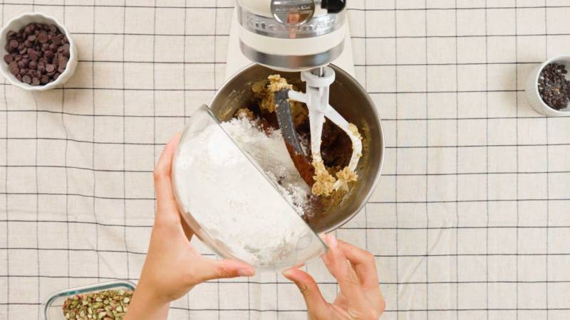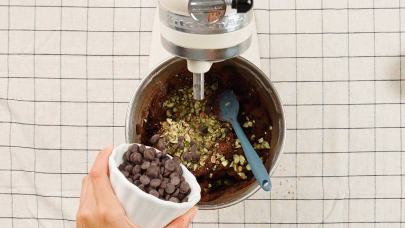 Die Zartbitterschokoladentropfen und die grob gehackten Pistazien unterheben, bis sie gleichmäßig verteilt sind.