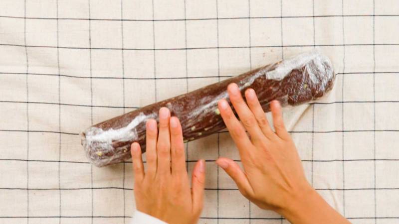 Rolle den Teig zu einer großen Rolle, wickle ihn in Frischhaltefolie ein und stelle ihn für mindestens 1 Stunde kalt. Je fester der Teig ist, desto einfacher lässt er sich in Scheiben schneiden.
