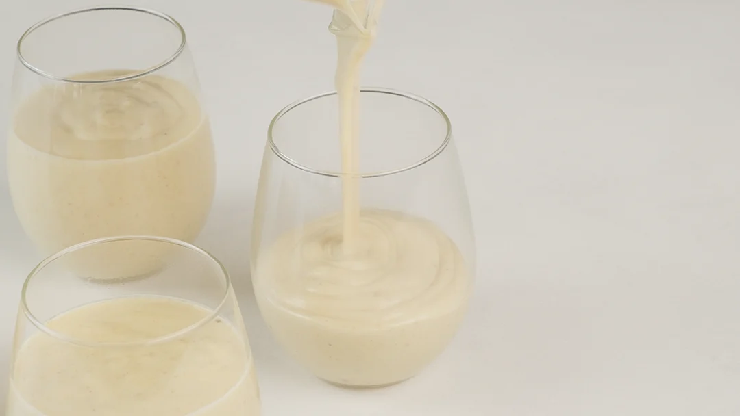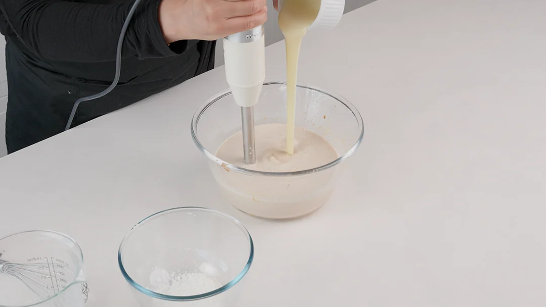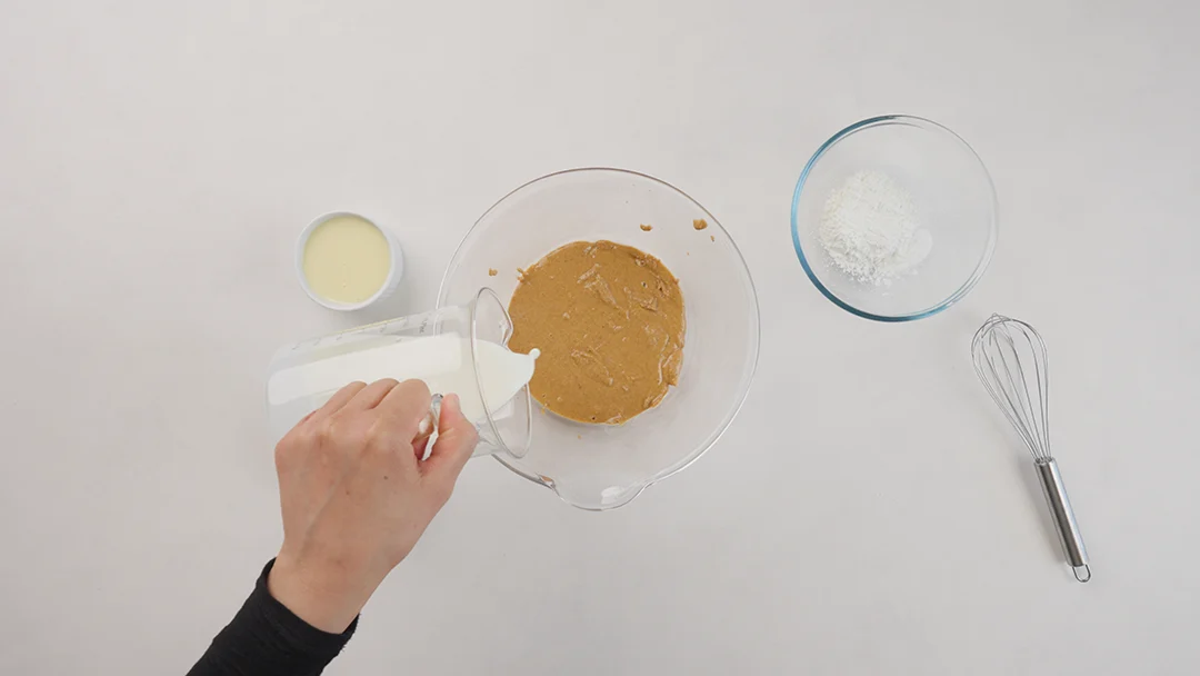 Gib die Milch zur Haselnusspaste und mixe, bis die Mischung glatt ist.