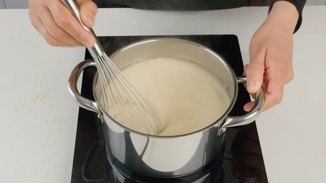 Gieße die Haselnussmilchmischung in einen Topf und bringe sie unter ständigem Rühren zum Kochen. Lasse sie eine weitere Minute kochen und rühre dabei ständig um, damit sie nicht anbrennt.