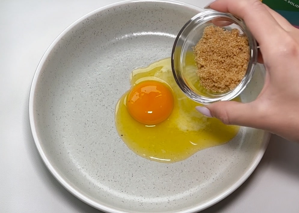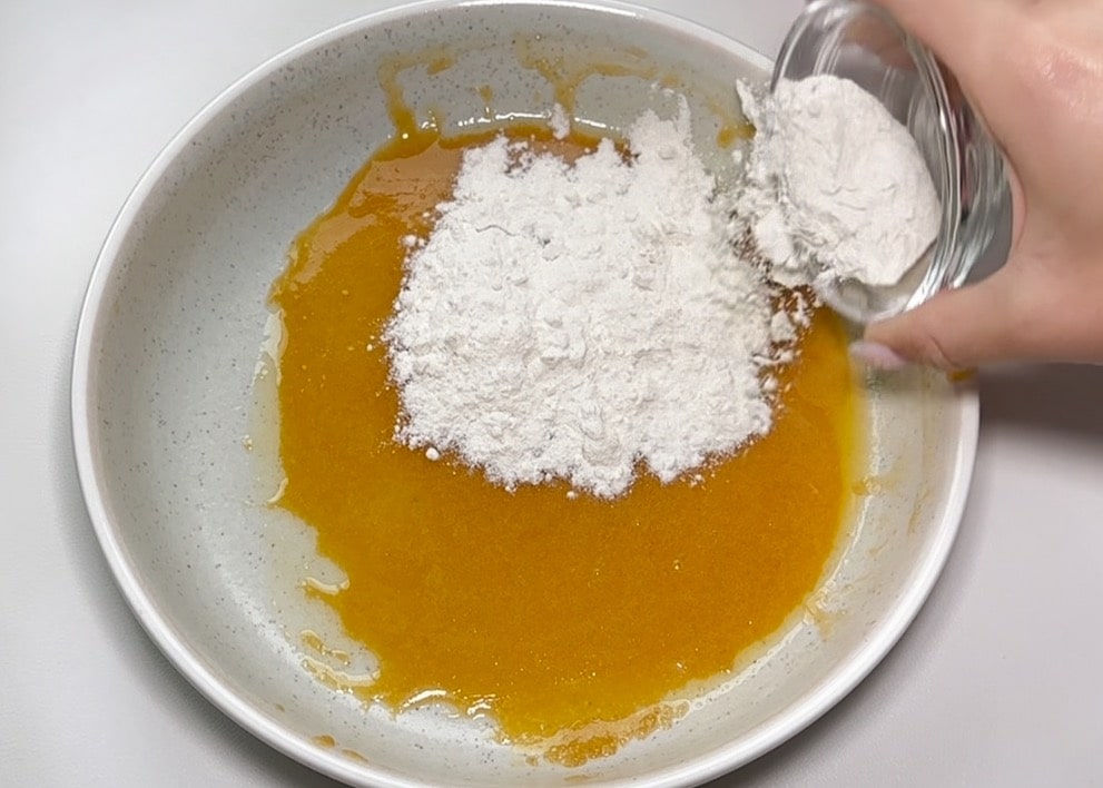 Das Eigelb dazugeben und gut verrühren.Füge trockene Zutaten hinzu