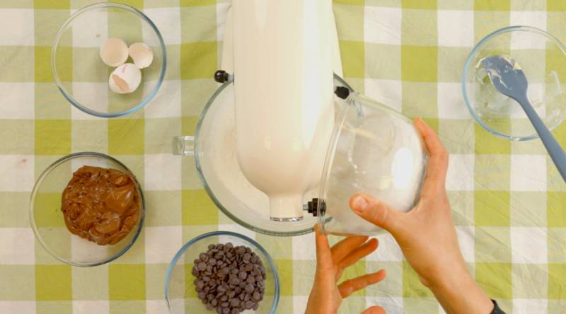 Vermische alle Zutaten für die Kekse, außer dem Schokoladenaufstrich, in einer Schüssel, bis ein Teig mit großen Krümeln entsteht.