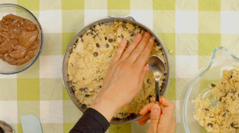 Verteile die Hälfte des Keksteig mit den Händen in einer Kuchenform mit einem Durchmesser von ca. 24 cm. Verteile die Schokoladencreme darauf und bedecke sie mit dem restlichen Teig. 30 Minuten backen.