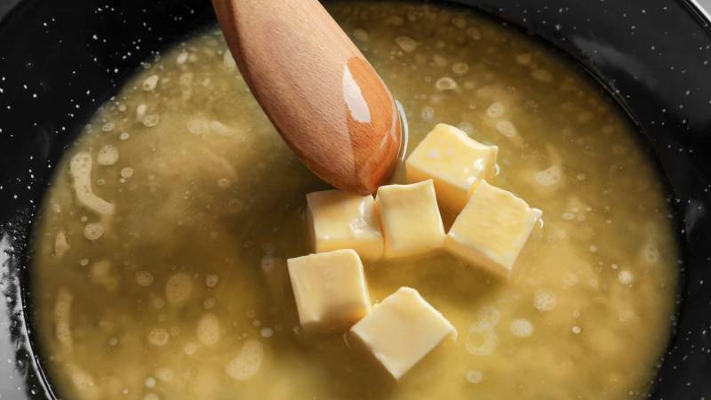 Die Butter in einem kleinen Topf bei schwacher Hitze schmelzen lassen, bis sie vollständig geschmolzen ist. Beiseite stellen.