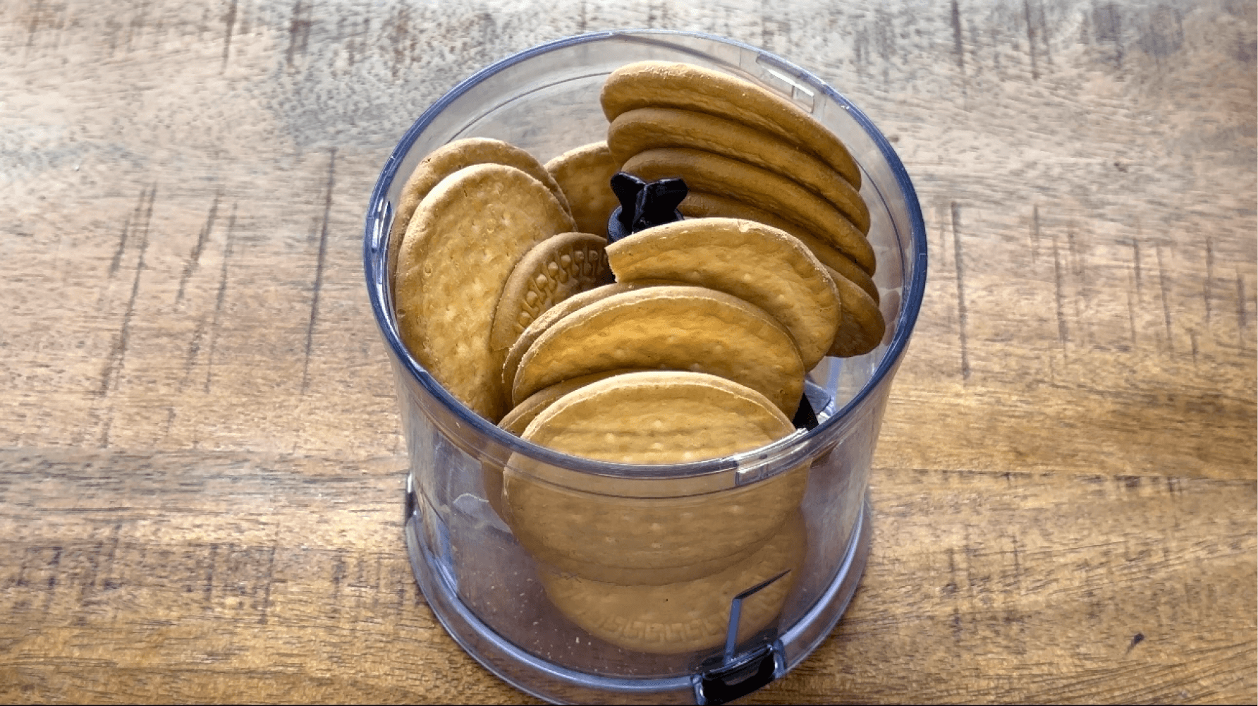 Gib die Kekse in einen Mixer und zerkleinere sie, bis sie fein gehackt sind. Gib die gehackten Kekse in eine große Rührschüssel.