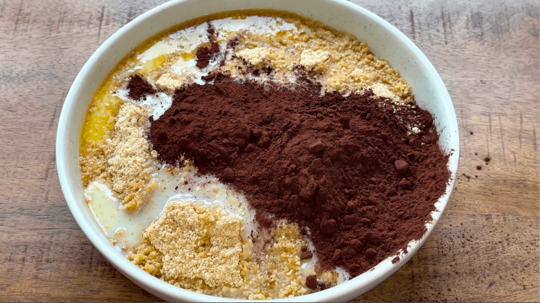 Füge die geschmolzene Butter, die Kondensmilch und das Kakaopulver von The Cocoa Circle zu den gehackten Keksen hinzu. Gut vermischen, bis die Zutaten gleichmäßig vermengt sind und einen einheitlichen Teig bilden.