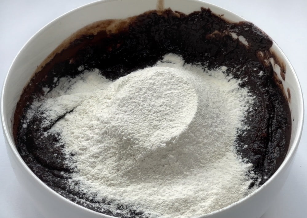 In einer separaten Schüssel das Allzweckmehl, das Kakaopulver und das Salz zusammen sieben. Die trockenen Zutaten nach und nach zu den feuchten Zutaten geben und verrühren, bis alles gut vermischt ist. Die geschmolzene Schokolade (2/3 der Menge) und die restlichen Schokoladenstückchen (1/3 der Menge) unterheben.Backen