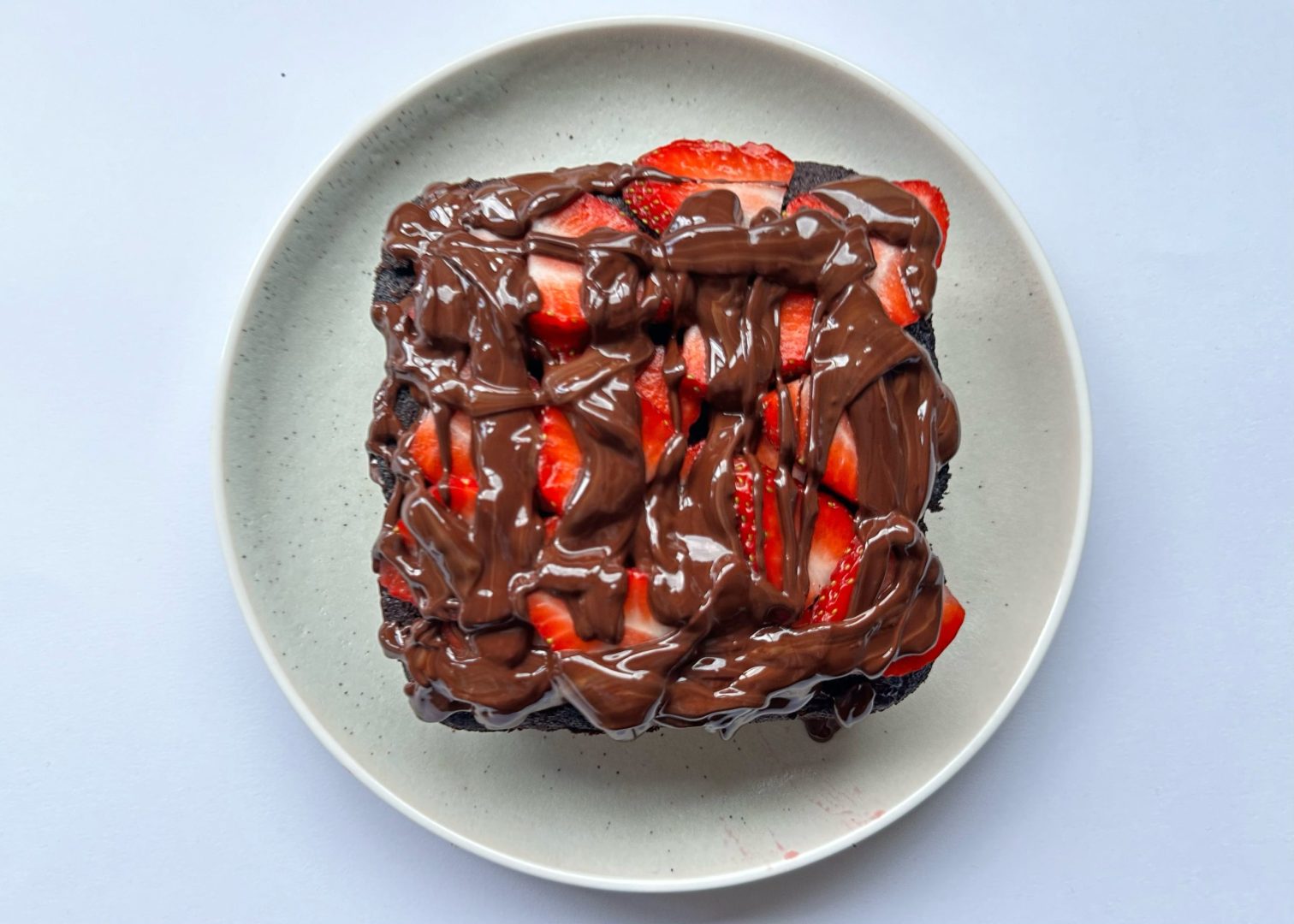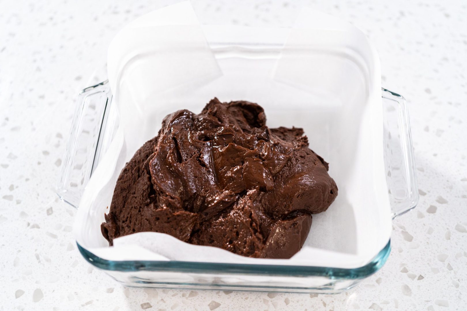 Heize deinen Backofen auf 175 °C vor. Fette eine 20 x 20 cm große Backform ein und lege sie mit Pergamentpapier aus, wobei du etwas überstehen lassen solltest, damit sie sich leichter herausnehmen lässt. In einer mikrowellengeeigneten Schüssel 2/3 der Schokoladenstückchen (ca. 67 g) in 30-Sekunden-Intervallen unter Rühren schmelzen, bis sie glatt sind. Zum Abkühlen beiseitestellen.