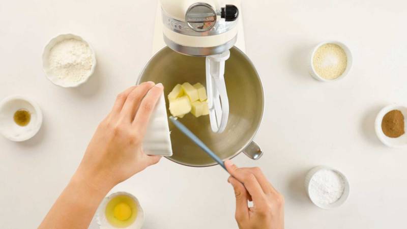 Butter und Puderzucker glatt rühren. Salz, Vanillepaste, Ei und Mandelpulver vermischen, bis alles gut vermengt ist. Den Teig in zwei gleiche Teile teilen.