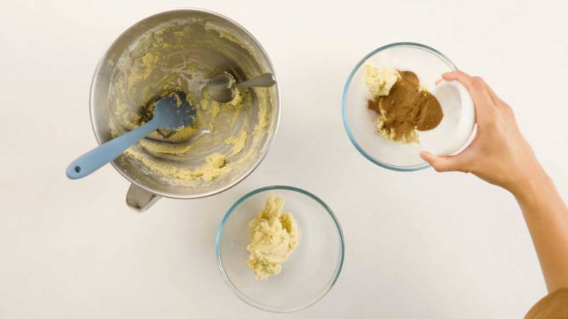 Füge 100 g Mehl hinzu, um den Vanille-Teig in einer Schüssel herzustellen. In der anderen Schüssel Mehl und Kakaopulver hinzufügen, um den Kakao-Teig herzustellen. Beide zu einem zusammenhängenden Teig vermischen.