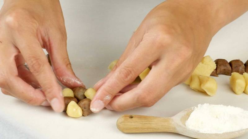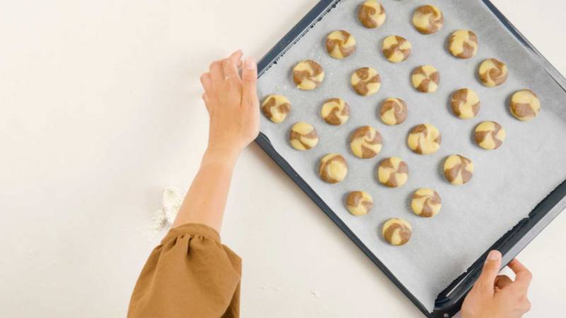 Schneide jeden Stab in 1 cm große Stücke und rolle die Stücke zu kleinen Kugeln. Für einen gemischten Keks vermische drei Vanillekugeln mit drei Kakaokugeln. Rolle sie vorsichtig zusammen, um einen marmorierten Keks zu formen.