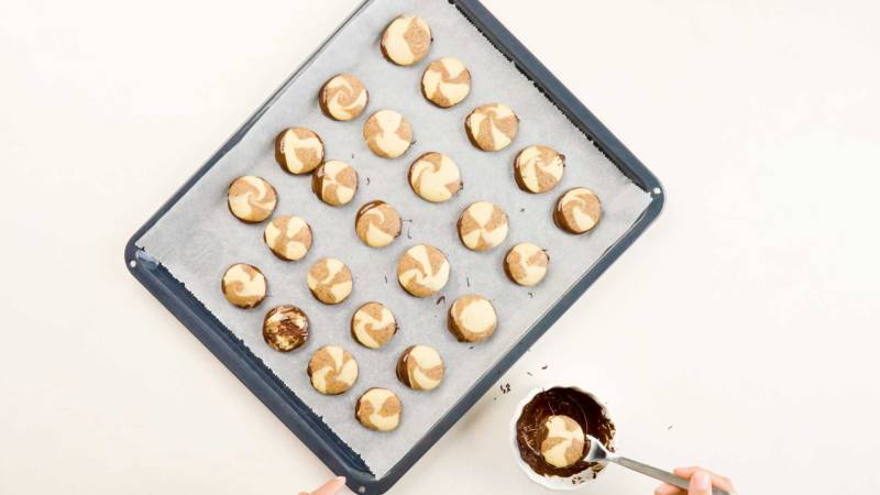 Genieße marmorierte Mandelkekse, die mit Vanille und Kakao verfeinert und für einen köstlichen Abschluss in Schokolade getaucht wurden.