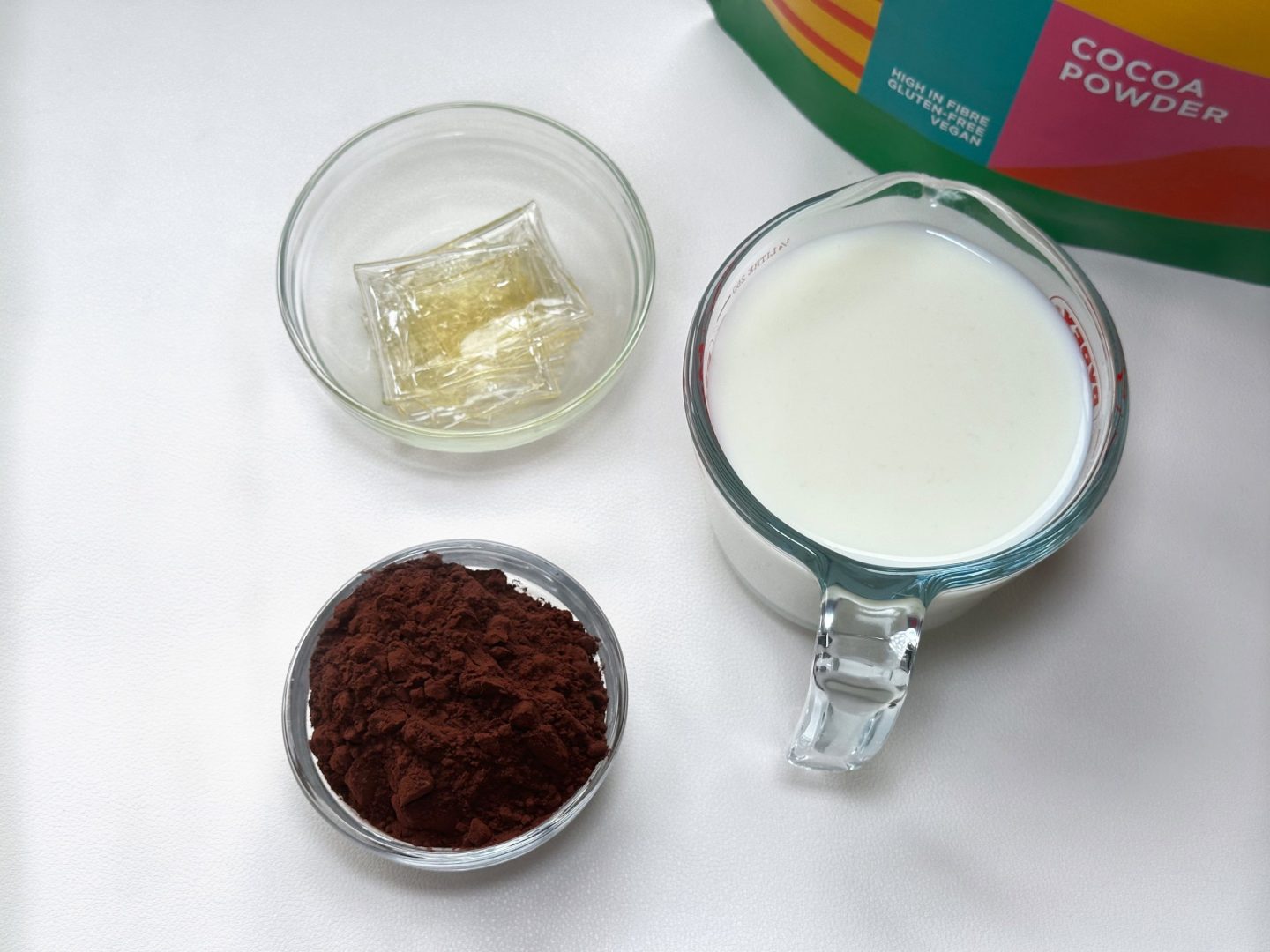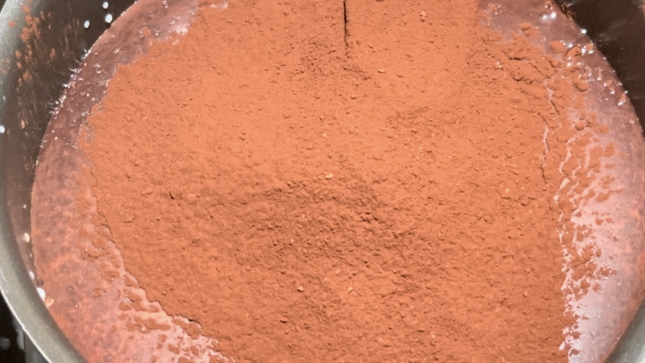 Die restliche Tasse Milch mit der gequollenen Gelatine (Pulver oder eingeweichte Blätter) und dem Kakaopulver in einem Topf vermengen. Bei mittlerer Hitze rühren, bis sich die Gelatine vollständig aufgelöst hat und die Mischung glatt ist. Nicht kochen, sondern nur leicht erwärmen, bis sie gerade durchgewärmt ist.In die Förmchen gießen