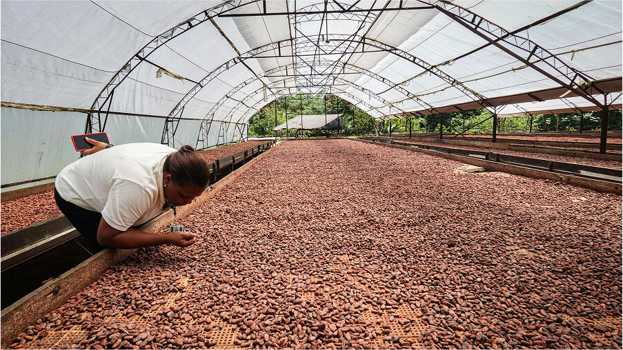 Leur système agroforestier comprend des jacquiers, des sapotiers, des bananiers et des orangers, qui offrent tous une ombre essentielle et nourrissent le sol pour les 4 128 cacaoyers en production. Mais les défis sont bien réels — entre systèmes d’irrigation défaillants et difficultés post-récolte causées par des conditions météorologiques extrêmes.