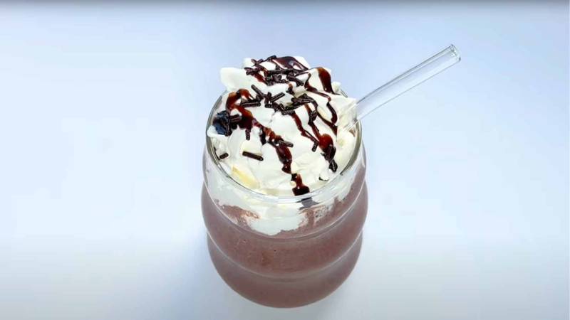 Décorez avec des garnitures supplémentaires, comme de la crème fouettée, du cacao en poudre ou des copeaux de chocolat. Servez immédiatement et savourez cette gourmandise rafraîchissante et gourmande !