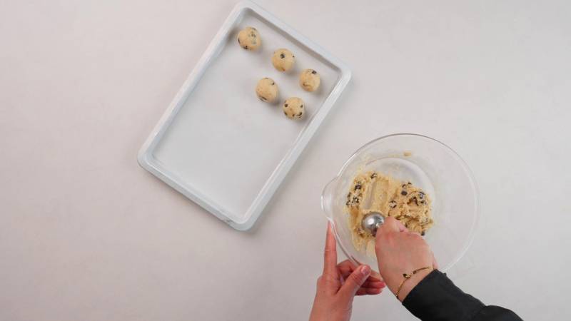 Gebruik een ijslepel om bolletjes deeg te scheppen en vorm ze tot mooie ronde ballen. Plaats de deegballen op een bakplaat bekleed met bakpapier. En zet ze minimaal een uur in de koelkast.