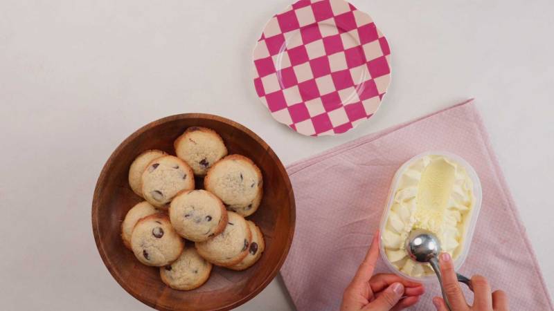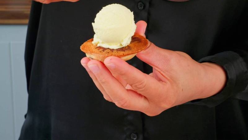 Wanneer de koekjes zijn afgekoeld, schep je het ijs op de onderkant van een koekje