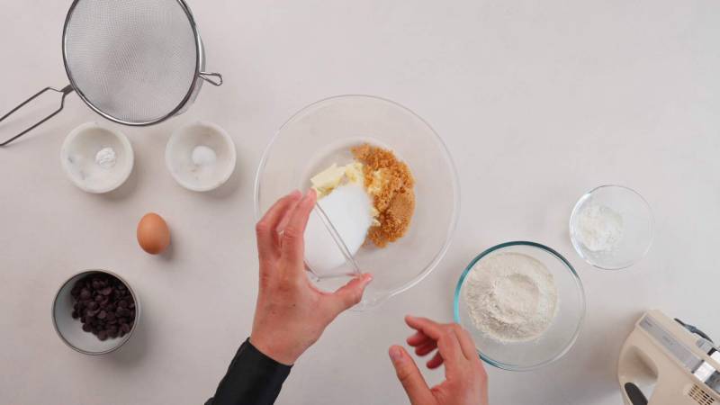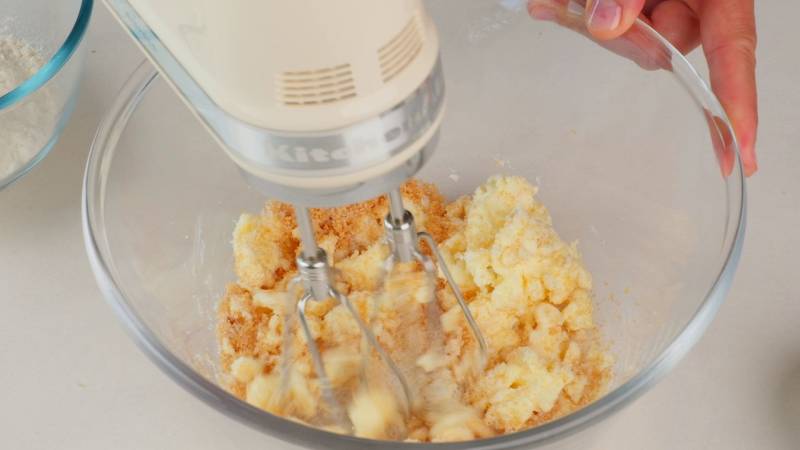 Klop de boter, lichtbruine suiker en kristalsuiker samen in een grote kom op gemiddelde hoge snelheid tot alles gemengd en romig is, voeg dan het ei toe.