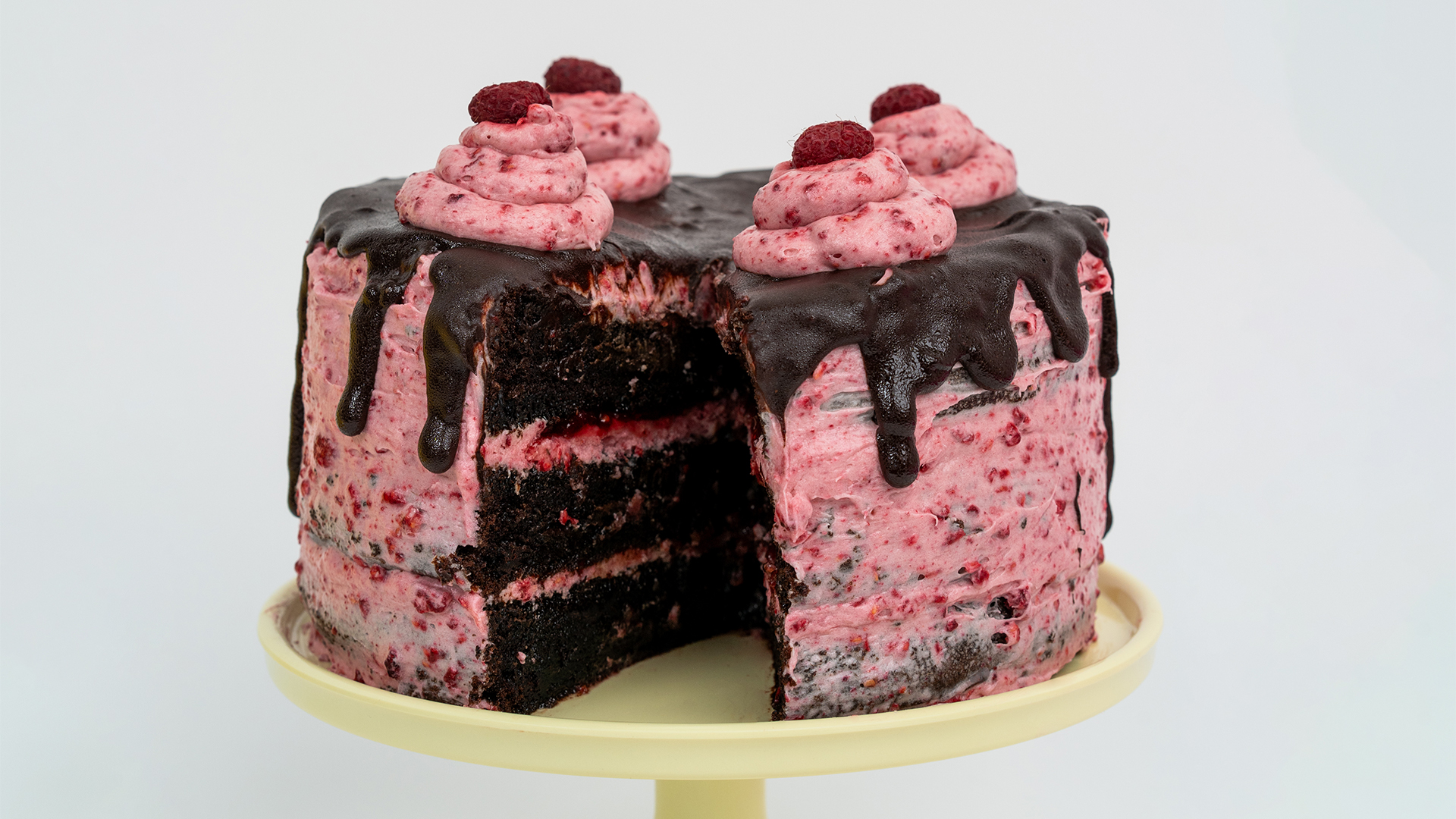 Plaats de eerste taartlaag op een standaard. Smeer een royale hoeveelheid glazuur op de taart en steek het iets uit over de randen. Spuit een rand en vul gelijkmatig met frambozenjam. Herhaal dit met de tweede laag en eindig met de laatste laag. Bestrijk de hele taart lichtjes met een dun laagje glazuur om de kruimels in te sluiten. Zet ongeveer een half uur in de koelkast.Breng nog een laag glazuur aan, zodat sommige delen van de taart zichtbaar zijn voor een semi-naakte look. Zet de taart opnieuw in de koelkast voordat je hem versiert.