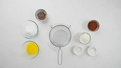 Zeef de bloem, cacaopoeder en baking soda in het eimengsel. Meng tot een glad deeg ontstaat.