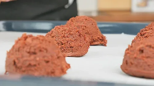 Verwarm de oven voor op 180°C. Bekleed een bakplaat met bakpapier. Schep porties deeg uit met een ijsschep en leg ze op de voorbereide bakplaat, laat ruimte tussen elk koekje.