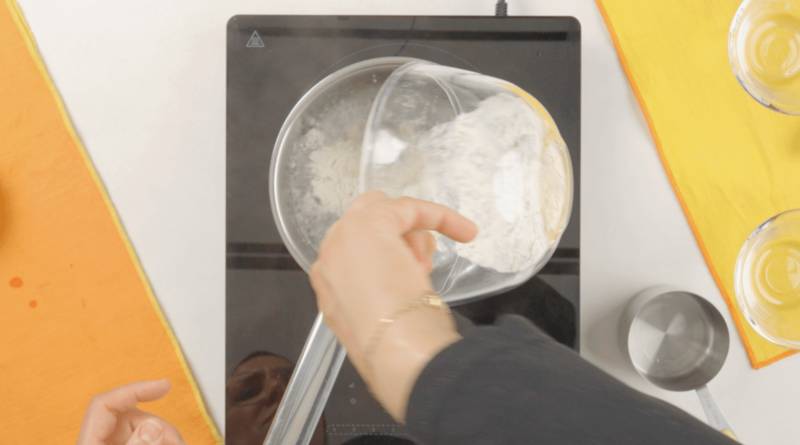 Breng in een middelgrote pan water, suiker, zout en 2 eetlepels olie aan de kook. Haal het van het vuur en voeg de bloem toe. Roer krachtig tot het deeg een bal vormt en loslaat van de zijkanten van de pan.