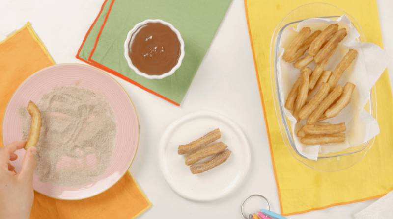 Verhit een royale laag olie in een diepe pan of frituurpan tot 180°C. Doe het churrodeeg in een spuitzak met een stervormig mondstuk. Spuit lange reepjes deeg in de hete olie en snijd ze af met een mes. Frituur de churros tot ze goudbruin en knapperig zijn, ongeveer 2-3 minuten aan elke kant. Laat ze uitlekken op keukenpapier.