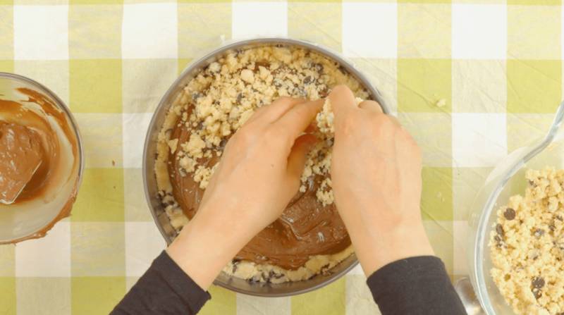 Verwarm de oven voor op 180°C. Meng in een kom alle ingrediënten voor de koekjes, behalve de chocoladepasta, tot je een deeg met grote kruimels krijgt.