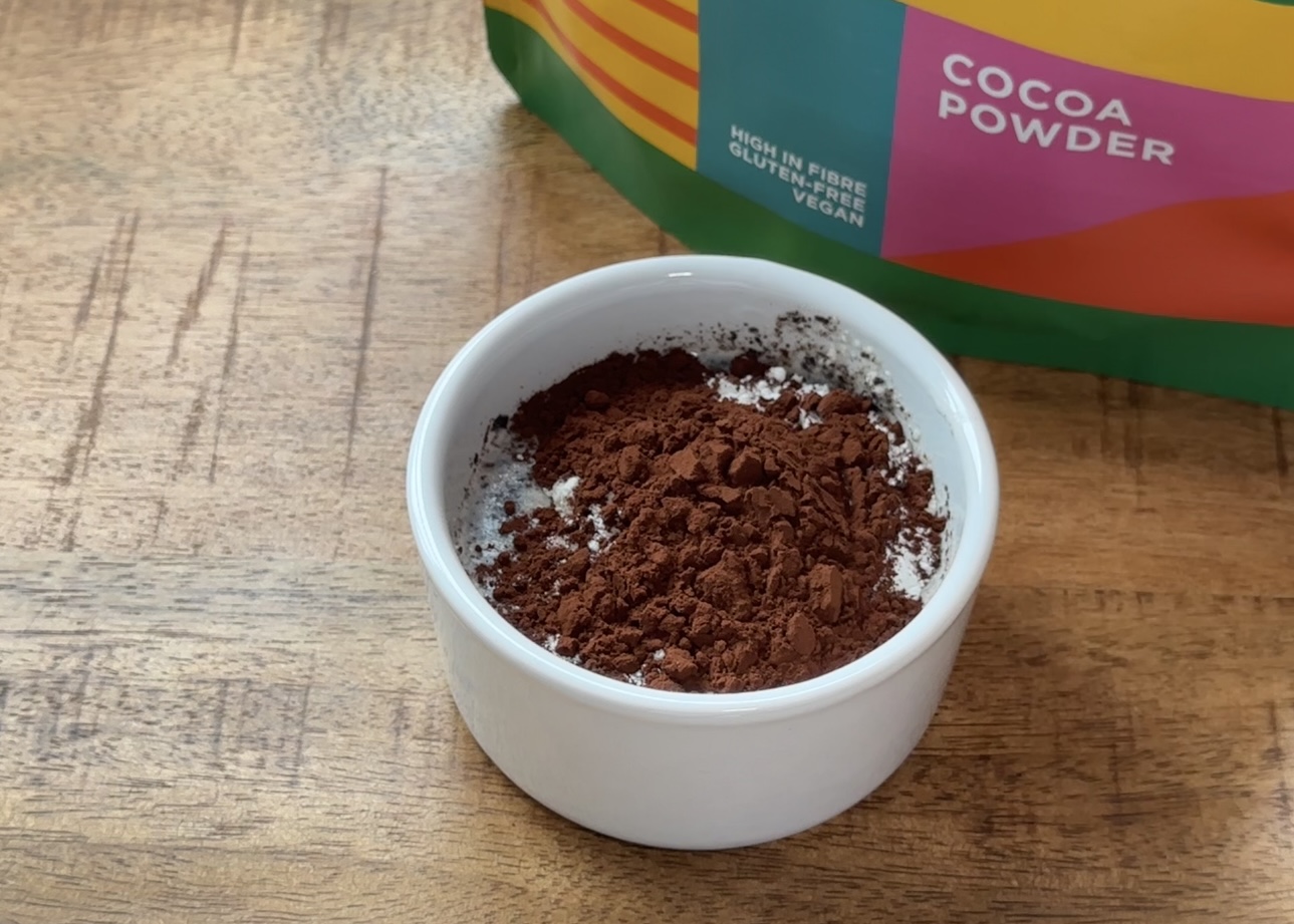 Meng in een klein kom de bloem, suiker, bakpoeder en cacaopoeder goed door elkaar.Meng Het Beslag