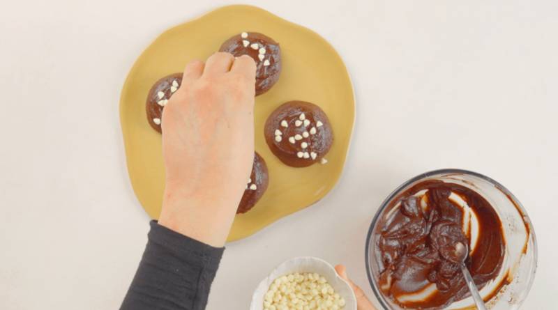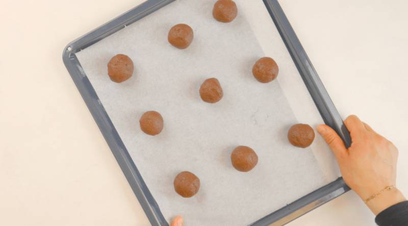 Roll the dough into large balls, ensuring enough space between each cookie. Bake for 10 to 11 minutes at 180°C. The cookies may still look soft when they come out of the oven.