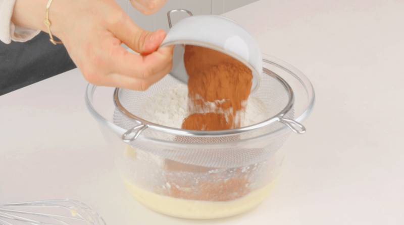 Sift the flour, baking powder, baking soda, cinnamon, cocoa powder, and salt into the wet mixture. Stir until just combined.