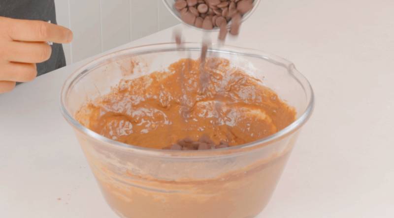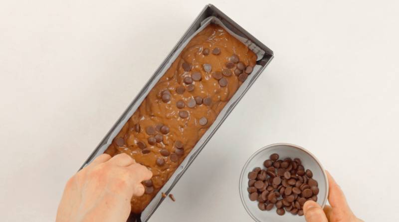 Pour the batter into the prepared cake pan and sprinkle with extra chocolate drops. Bake in the preheated oven for 50-55 minutes, or until a skewer inserted into the center comes out clean.