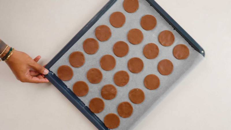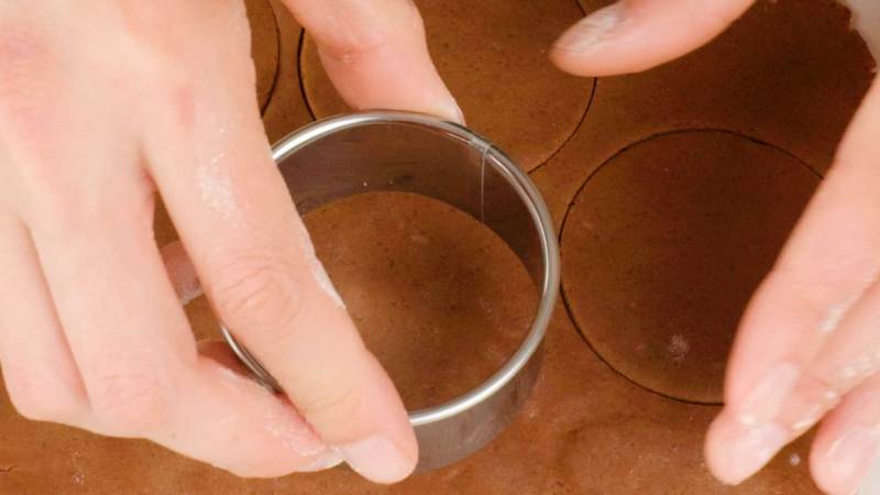 Preheat your oven to 175°C. Line baking trays with parchment paper. Roll out the dough on a floured surface to 4–5 mm thickness. Work with small portions to avoid tearing. Cut out rounds (4–5 cm in diameter) and place them on the prepared tray.