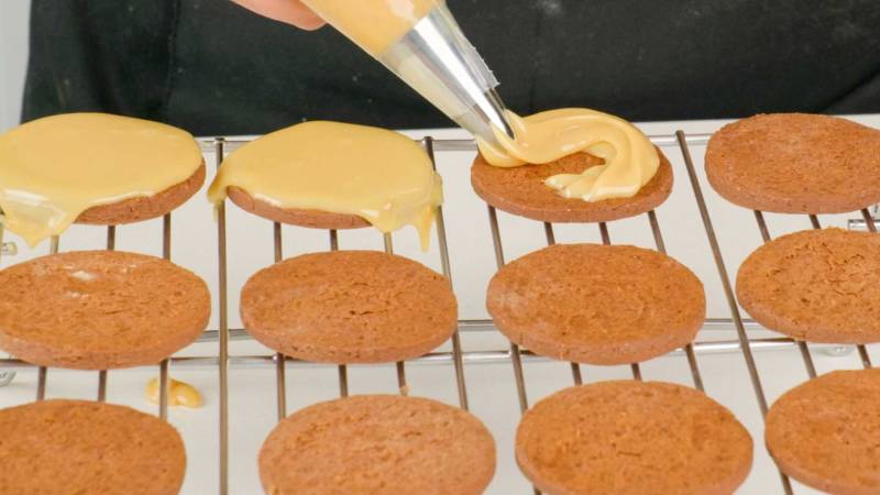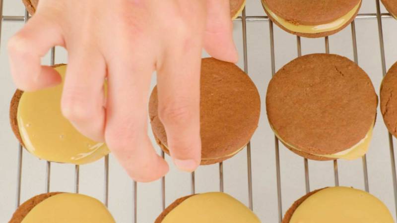 Pipe a dollop of dulce de leche onto half of the cookies.