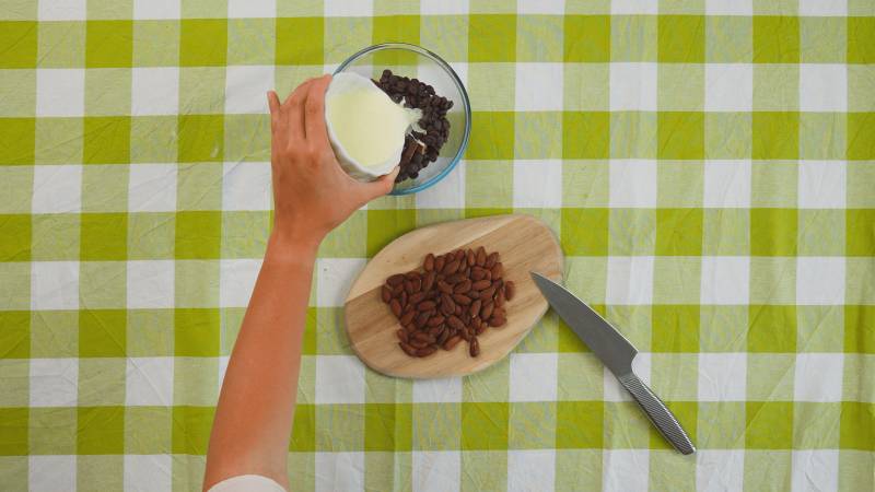 In a saucepan, bring the unwhipped whipping cream to a boil. Remove the saucepan from the heat and add the chocolate drops. Let it stand for a minute. After a minute, stir the mixture until smooth. Add the chopped almonds and mix until combined.