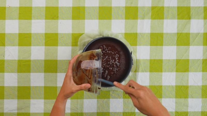 Spread the almond chocolate ganache over the completely cooled cake. Let the cake stand for a few hours until the topping is firm.