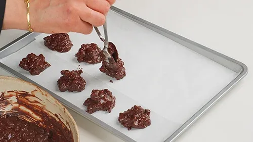 Line a baking tray with parchment paper. Scoop out portions of the chocolate mixture and shape them into rough rock-like shapes. Place them on the prepared baking tray.