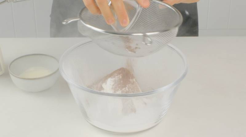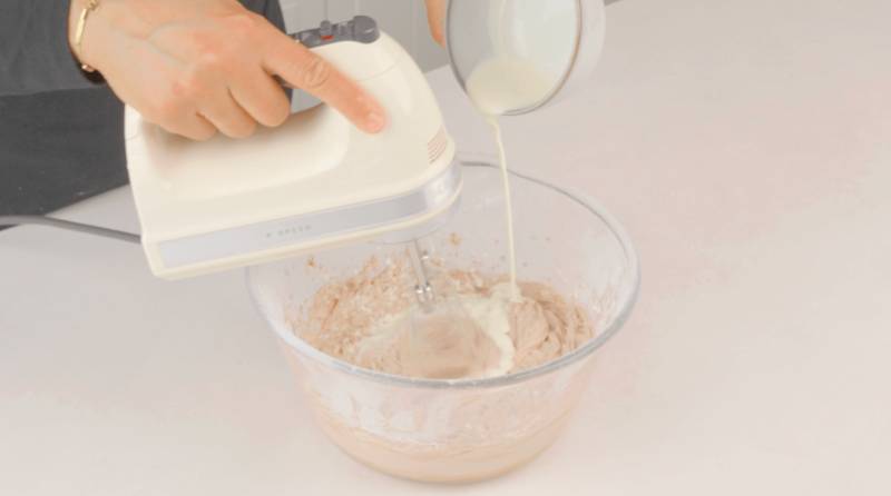 In a mixing bowl, beat the eggs, granulated sugar, vanilla sugar, and salt on medium-high speed for two minutes until creamy. Gradually pour in the sunflower oil and mix until fully absorbed. Sift the baking powder, flour, and cocoa powder together, then add to the batter and mix on low speed. Finally, mix in the milk.