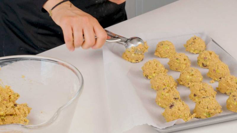 Scoop dough into even balls and place on the prepared baking sheet. Sprinkle tops with reserved pistachios and extra chocolate chips if desired.