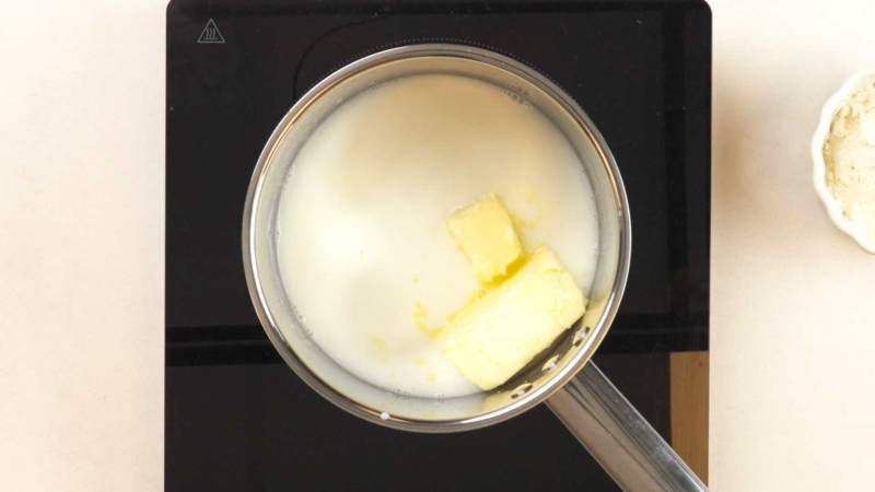 Preheat the oven to 210°C and line a baking tray with baking paper. Combine the milk, water, butter, and salt in a pan. Heat slowly until the butter is fully melted and the mixture just begins to boil.