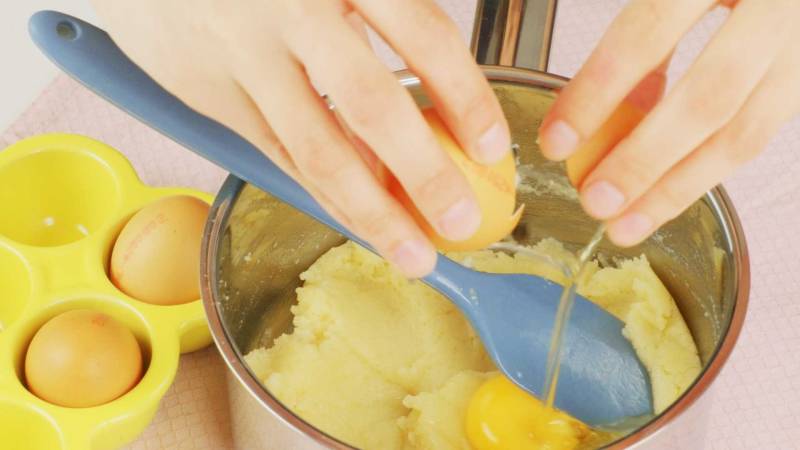Transfer the dough to a bowl and let it cool slightly. Gradually add the eggs, one at a time, mixing thoroughly after each. Adjust with the fourth egg or half of it if necessary, ensuring the dough is smooth and pliable.