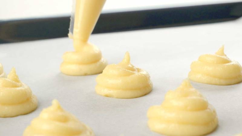 Transfer the dough to a piping bag with a smooth nozzle (10–12 mm). Pipe 2 cm-wide and 2 cm-tall rounds onto the prepared baking tray, leaving space between each. Alternatively, shape using two spoons. Use a wet finger to flatten any peaks on the tops of the profiteroles for an even finish.