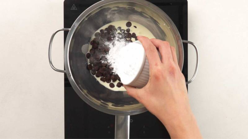 In a heatproof bowl, combine the whipped cream, dark chocolate, and powdered sugar. Heat over a bain-marie (double boiler) until smooth. Remove from heat and stir briefly to finish.