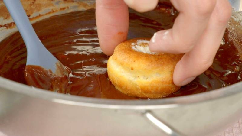 Dip the tops of the filled profiteroles into the prepared chocolate glaze. Place the glazed profiteroles on a baking sheet or plate and refrigerate until the chocolate sets.