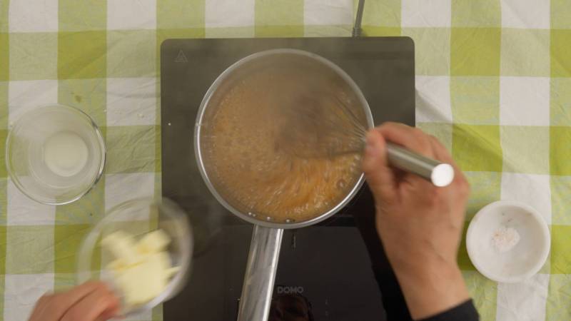 Melt the sugar in a pan over medium heat until it reaches a rich caramel color. Once it does, quickly add the cream and stir until the mixture becomes smooth again. Add the butter and continue stirring until fully combined. Let the mixture cool before using.