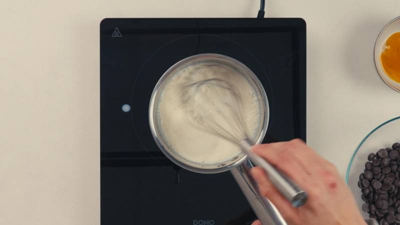 Pour the hot milk mixture over the chocolate and stir until the chocolate has completely melted. Then mix in the egg yolks.