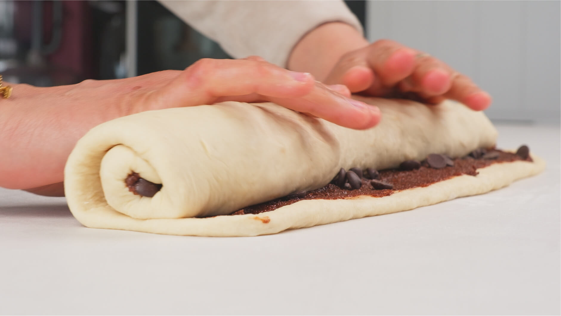 Starting from one short end, roll up the dough into a log and pinch the seam closed.