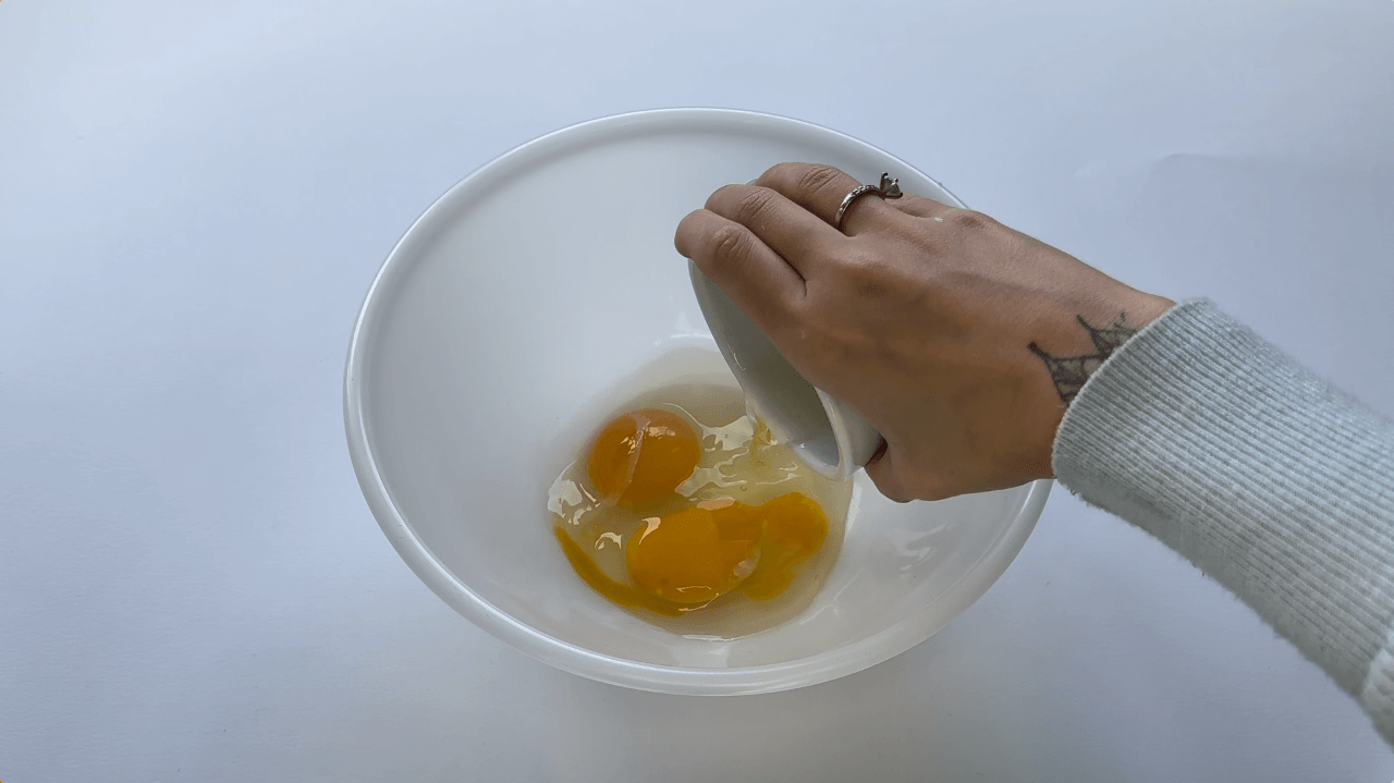 Crack the eggs into a bowl to check for freshness. Beat them with a whisk until smooth.