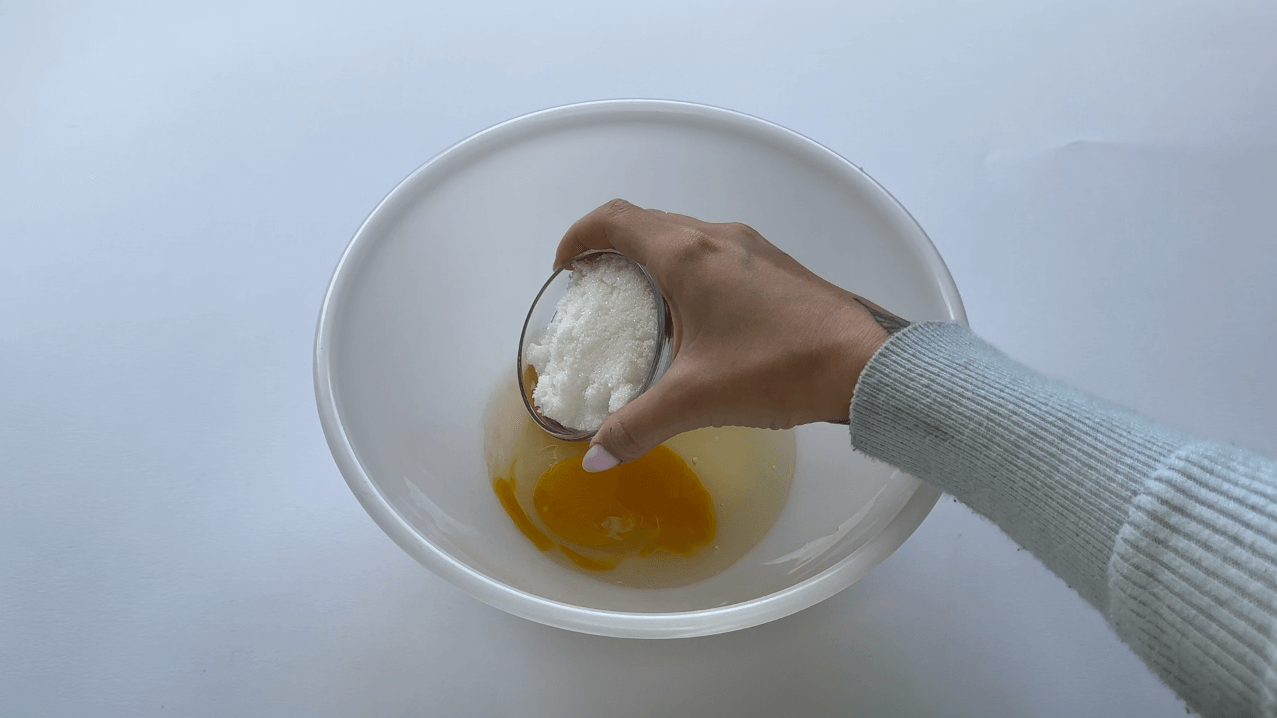 Gradually whisk in the sugar to the beaten eggs, mixing quickly to prevent lumps from forming.